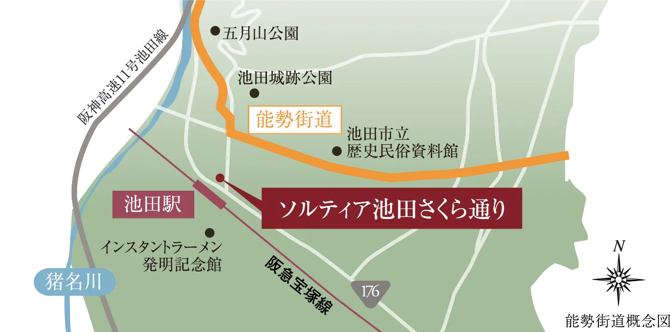 大阪から池田を経て能勢・亀岡方面へとつながる「能勢街道」。さまざまな物質の運送に利用されたほか、庶民らに信仰された能勢妙見への参詣道でもあった豊かな記憶を宿すこの道に隣接しています。