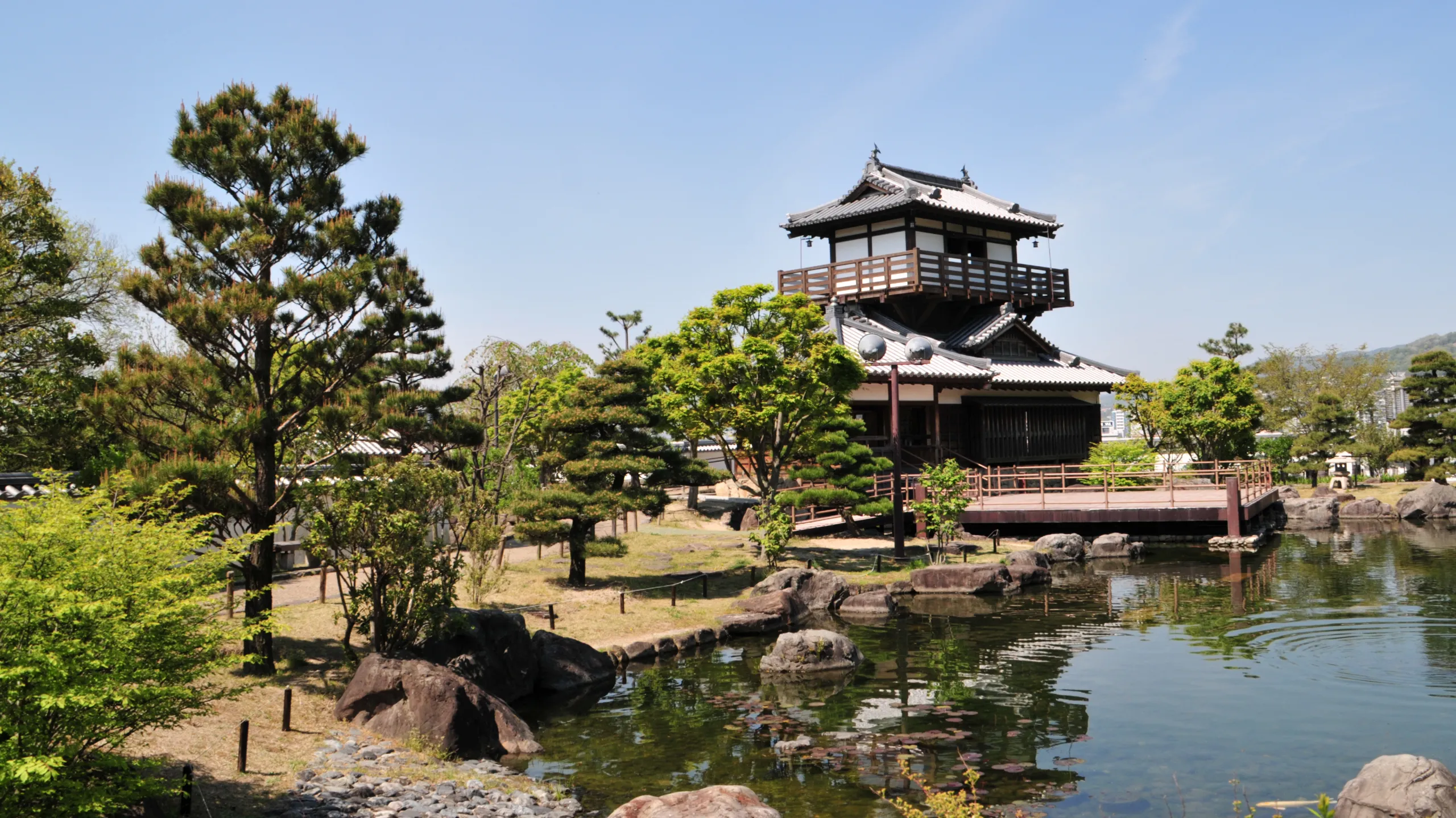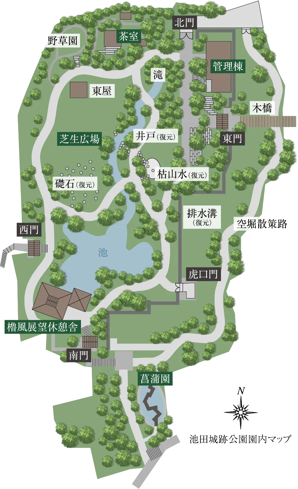 室町時代から戦国時代にかけて池田市エリアを収めた地方豪族・池田氏の居城跡地に整備された公園。やぐら風展望休憩舎からは、園内はもちろん池田市街地までも一望できます。