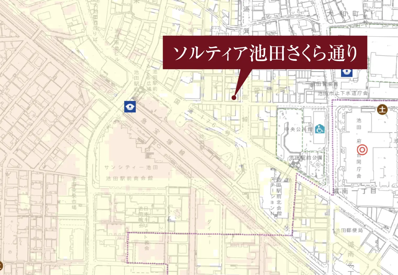 “駅2分の静域”に住まう。 - 暮らしの舞台となるのは、阪急「池田」駅から北へ進み、さくら通りから一歩奥まった地。駅前の利便を想いのままに享受しながら、穏やかな暮らしの空気が息づくアドレスです。