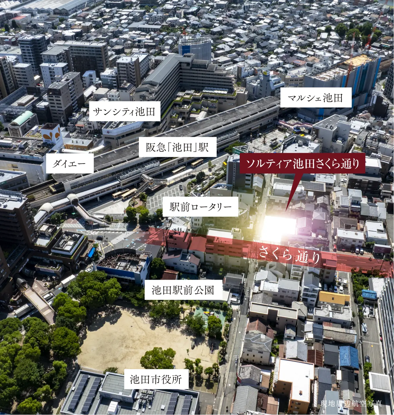 阪急宝塚線「池田」駅から北へ徒歩2分。五月山や池田城跡公園につながる池田のシンボルストリート「さくら通り」沿いに、駅前と正面から対峙するレジデンス「ソルティア池田さくら通り」。私らしく駅前を使いこなす、新しい暮らしがここから。