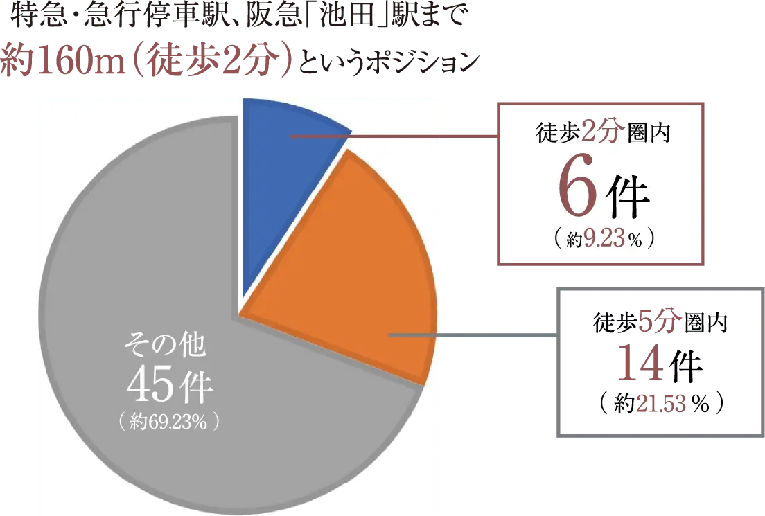 2016~2025年の10年間において供給された新築分譲マンションのうち、阪急「池田」駅を最寄り駅とする物件は65件。 そのうち、駅徒歩2分という優れたアクセス性を叶えたのは6件のみ(全体の約9%)。 まさに、「もう出会えないかもしれない駅前物件」といえるでしょう。