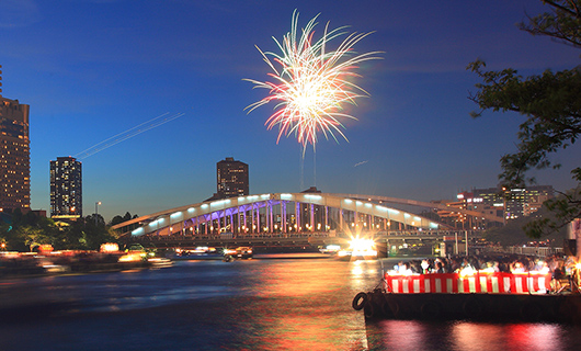 大阪天満宮の天神祭は、日本三大祭の一つ。毎年、7月25日の本宮の夜は大川に多くの船が行き交う船渡御が行われ、奉納花火が上がります。大川に映る篝火や提灯灯り、花火などの姿から、火と水の祭典とも呼ばれています。