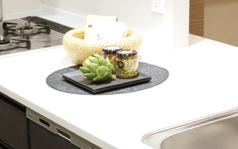 清潔感と高級感がある人造大理石天板。サッと拭き取るだけで汚れが落ち、お手入れも簡単にできます。