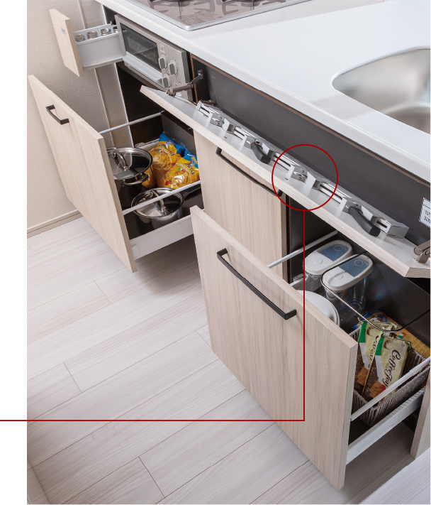 大容量で中身が見やすく出し入れが簡単な引き出し式のキッチンキャビネット。また、ゆっくりと扉が閉まるソフトクローズ機能を採用。閉まる際の衝撃を和らげ、不快な音を抑えます。