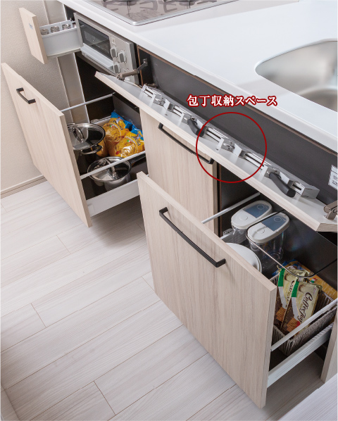 シンク前には、包丁の出し入れに便利な包丁収納スペースを設けました。ロック機能を備え安全性にも配慮しています。