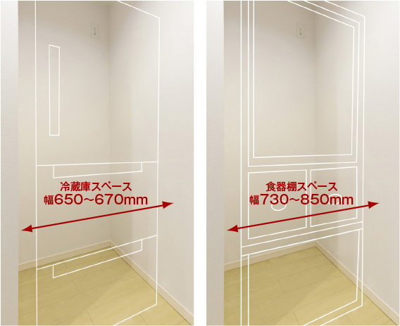 キッチンには幅650~670mmの冷蔵庫スペースと幅730~850mmの食器棚スペースを確保しています。