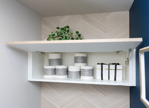 トイレットペーパー、その他の収納に便利な吊戸棚は手が届きやすい高さと形状です。