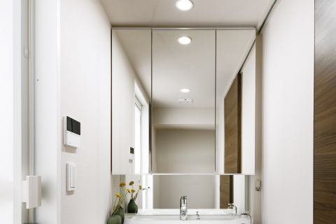 洗面化粧台には、三面鏡や、洗面ボウルのお手入れに便利なホース付水栓を採用しています。ミラー上部にはLEDダウンライトを設置して、顔や手元をはっきり映します。