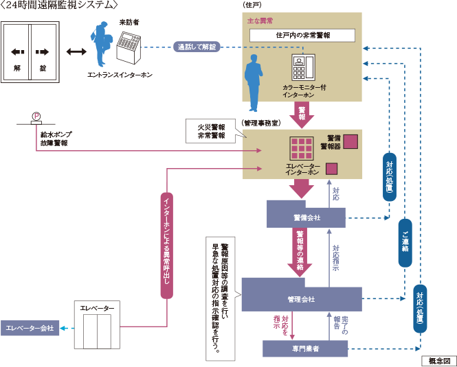 住戸内の火災、非常時などの警報装置は、24時間警備会社で監視しています。万が一の場合、警備会社のガードマンが駆けつけ、関係機関への連絡等の対応を行います。また、共用施設では、火災、給水ポンプの故障なども警報装置により監視。エレベーターの運行はエレベーター会社が監視しており、停止などの異常にはエレベーター会社の担当者が迅速に駆けつけ対応します。