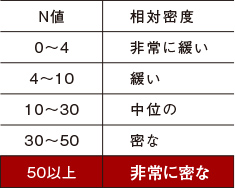 標準貫入試験によって求められた、地盤の強度を表す単位のことです。標準貫入試験とは、63.5kgの重りを76cmの高さから自由落下させて鋼製棒を打ち込むという試験で、その鋼製棒を土中に30cm打ち込む(貫入させる)のに要する打撃回数を測定します。落下打撃回数の値がN値で、その数が多いほど地盤が硬いということになります。