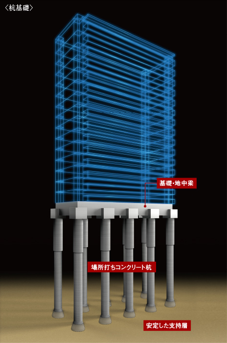 綿密な地盤調査により検出した、地下約33m、N値60以上の硬い支持層に6本の場所打ちコンクリート杭を打設。現場の地盤に適した深さに多数の杭を埋め込むことで強固な建物構造を実現しています。