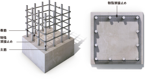 建物を支える柱の主筋を水平方向に束ね、主筋とコンクリートを拘束する役割を果たす外周部の帯筋には、溶接閉鎖型帯筋を採用。通常の帯筋に比べ、せん断力に対する拘束力が高く、建物に粘り強さを持たせます。