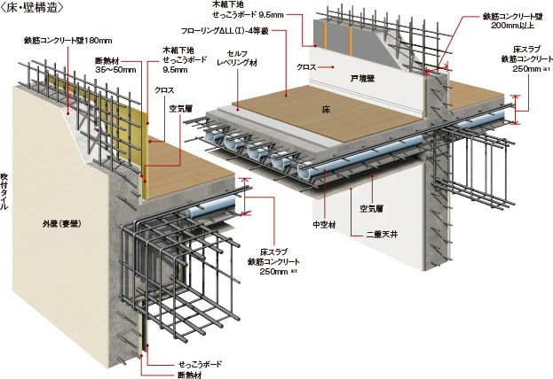 耐震性を保ち、プライバシーを守る住戸と住戸の間の戸境壁は、快適な住空間を実現する200mm厚以上を確保。
