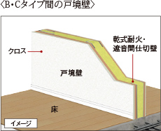 ※壁厚に関しては、一部異なる場合があります。※B・Cタイプ間の戸境壁は乾式耐火・遮音間仕切壁となります。※詳しくはプラン集をご確認ください。