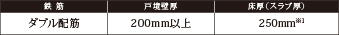 耐力壁として、しっかりとした構造と厚みを持たせています。また、床の厚さを意味するスラブ厚は250mmとしています※1。