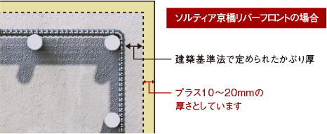 長く建物の性能を保つために重要なポイントとなる、鉄筋を覆うコンクリートのかぶり厚は、建築基準法で定められたかぶり厚よりもプラス10mmの厚さとしています。また、打放し仕上げ部分はさらにプラス10mm以上、合計20mmのかぶり厚として鉄筋の劣化を抑制しています。