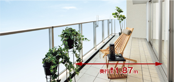 室内から続くような開放感を演出する奥行最大.87mのバルコニー。ガーデニングなど楽しみが広がります。