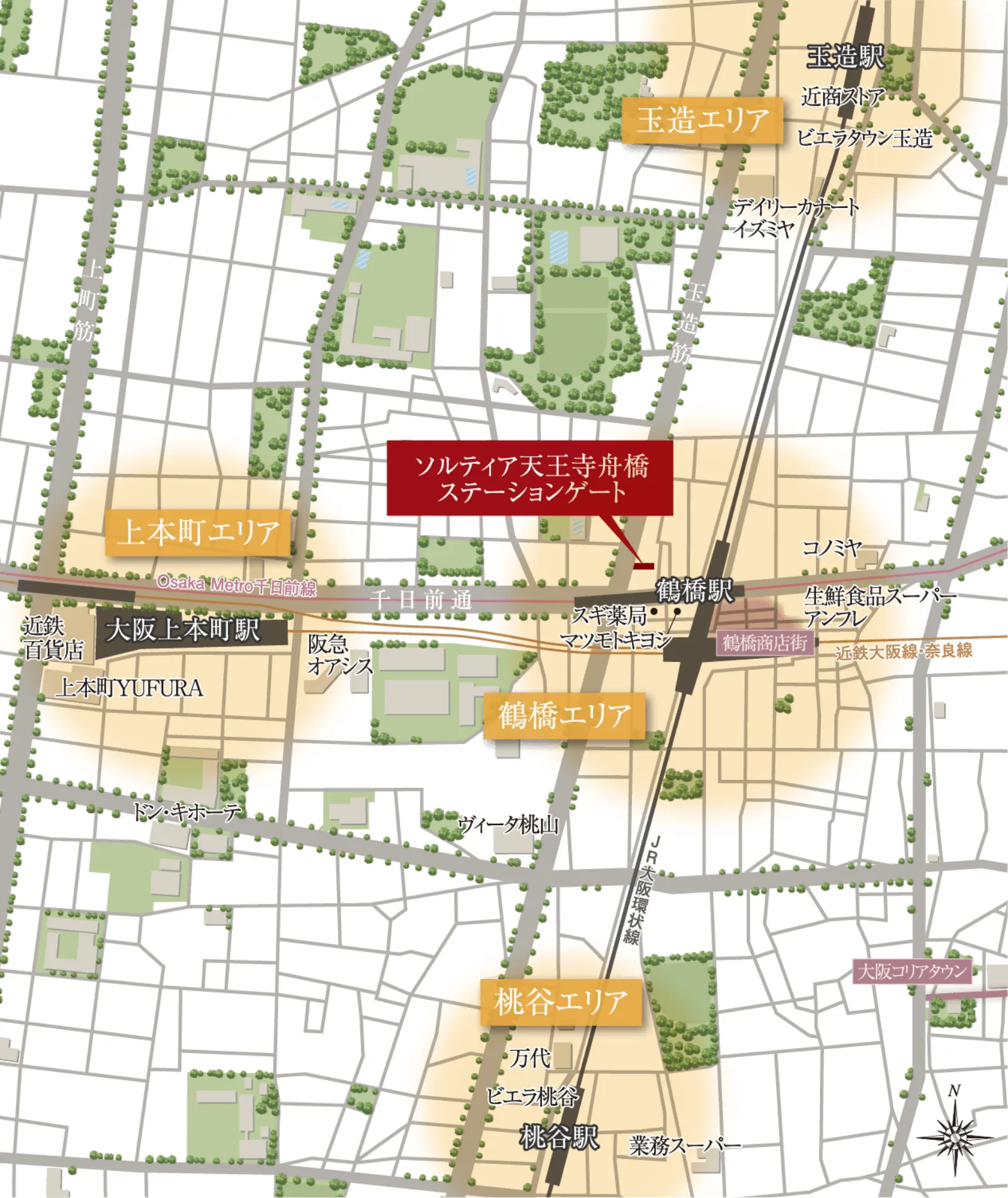 「鶴橋」エリアだけでなく、成熟の住環境が整う「上本町・玉造・桃谷」エリアも身近にあり、