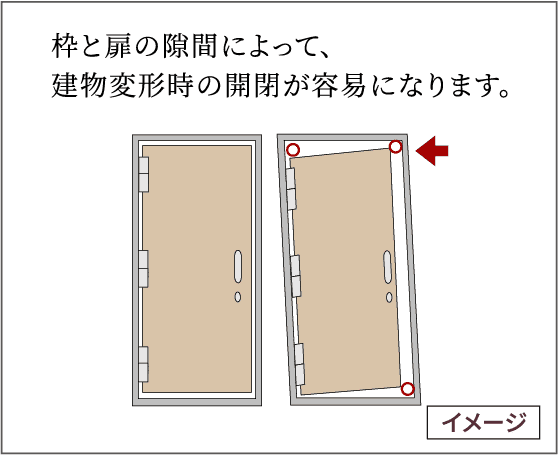 玄関扉と枠の間に設けた隙間により大地震による変形時の開扉性を高めました。