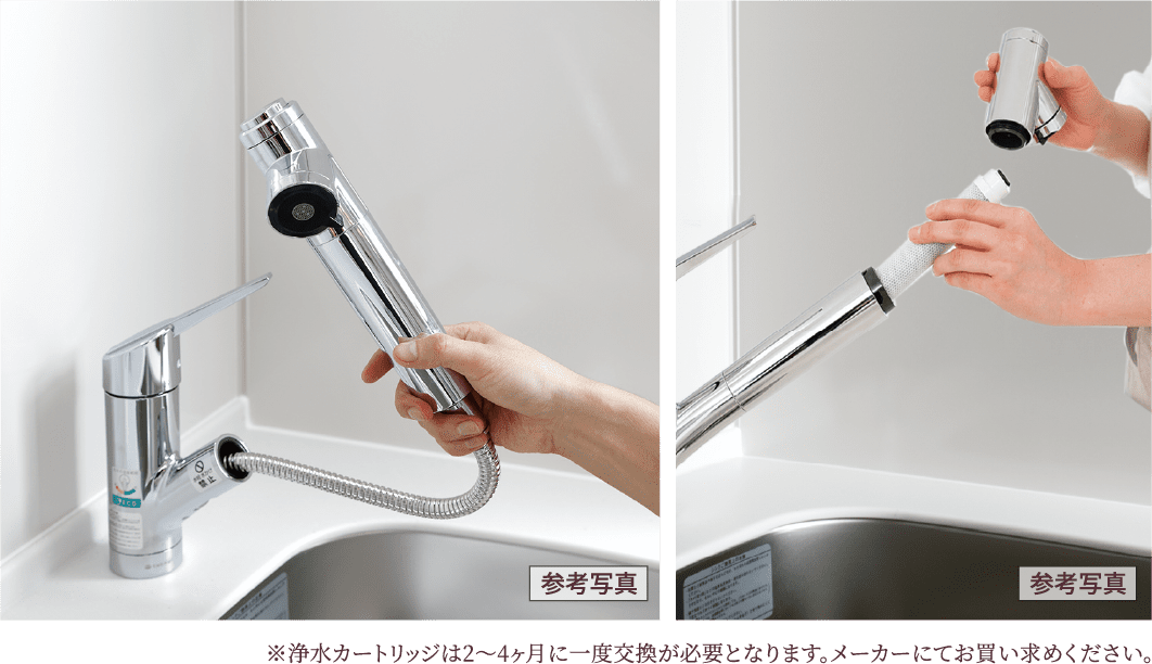 ホースを引き出せるシャワー水栓で、シンクのすみずみまできれいに洗い流せます。また浄水カートリッジ使用時には、気になるカルキ臭や細かな混入物を手軽にろ過。入居者が安心できるきれいな水を使用できます。