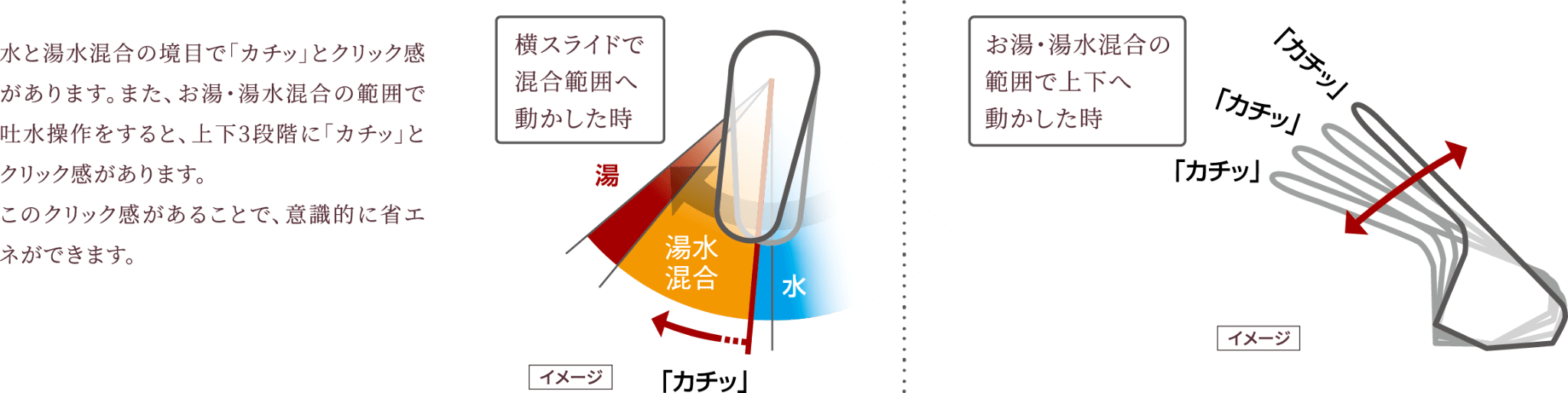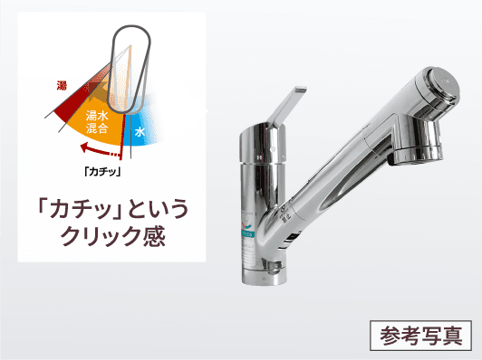 クリック感で水と湯を使い分け、ガスのムダな消費を防ぎます。