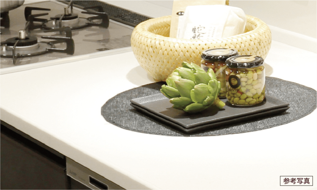 清潔感と高級感がある人造大理石天板。サッと拭き取るだけで汚れが落ち、お手入れも簡単にできます。