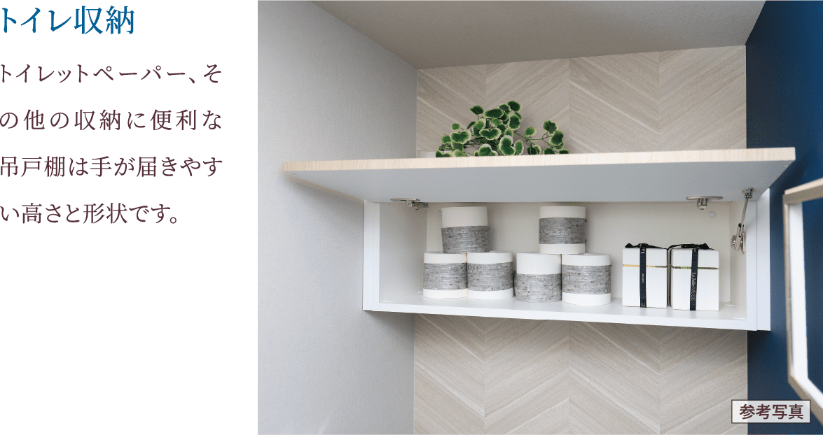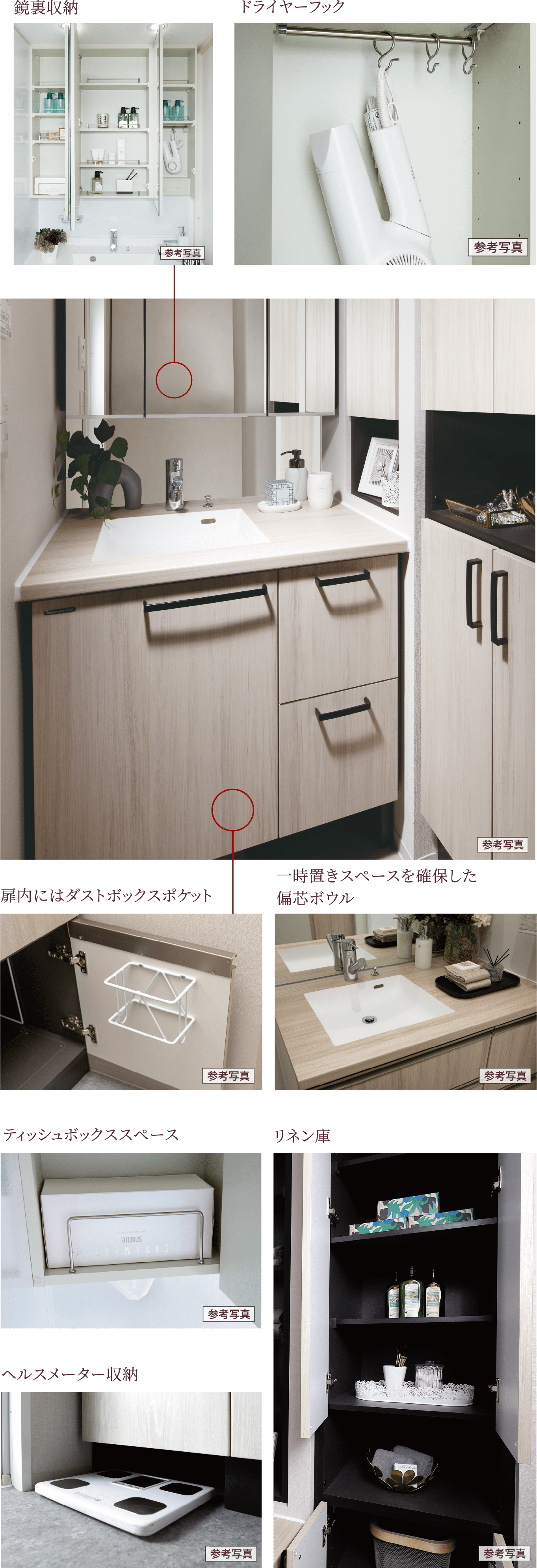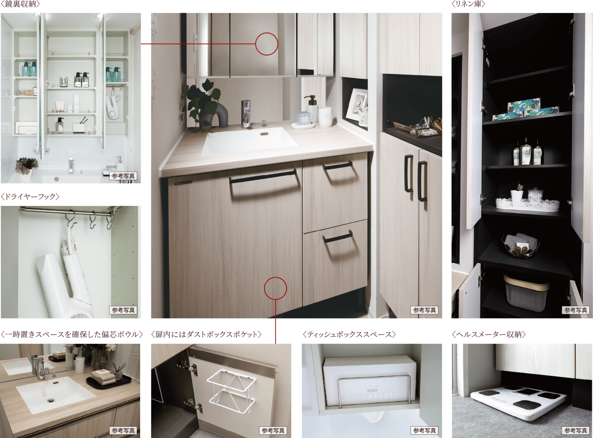 洗面化粧台の下部にはダストボックスポケットを設け、スッキリ整理された空間を保ちます。化粧品や洗面用具の収納にピッタリの鏡裏収納はティッシュボックススペースやコンセントを設け使い勝手を高めます。また、タオルなどの収納に便利なリネン庫を設置しました。