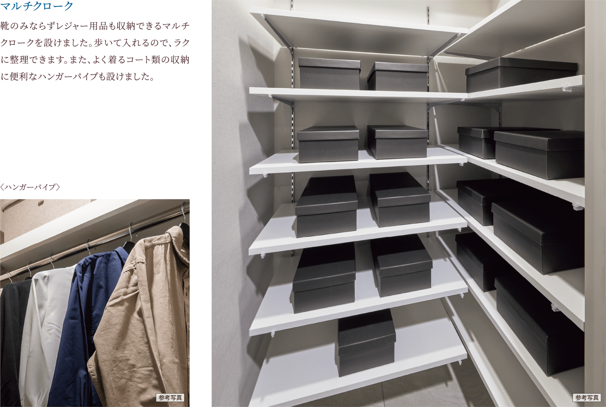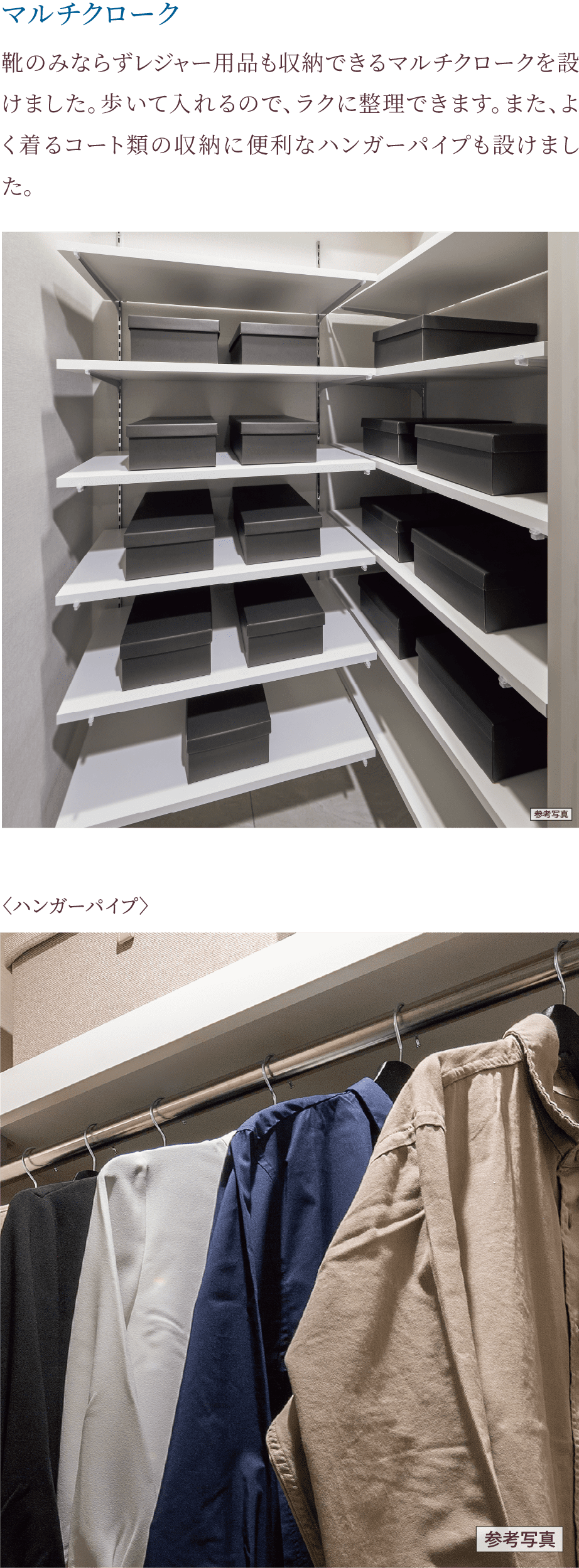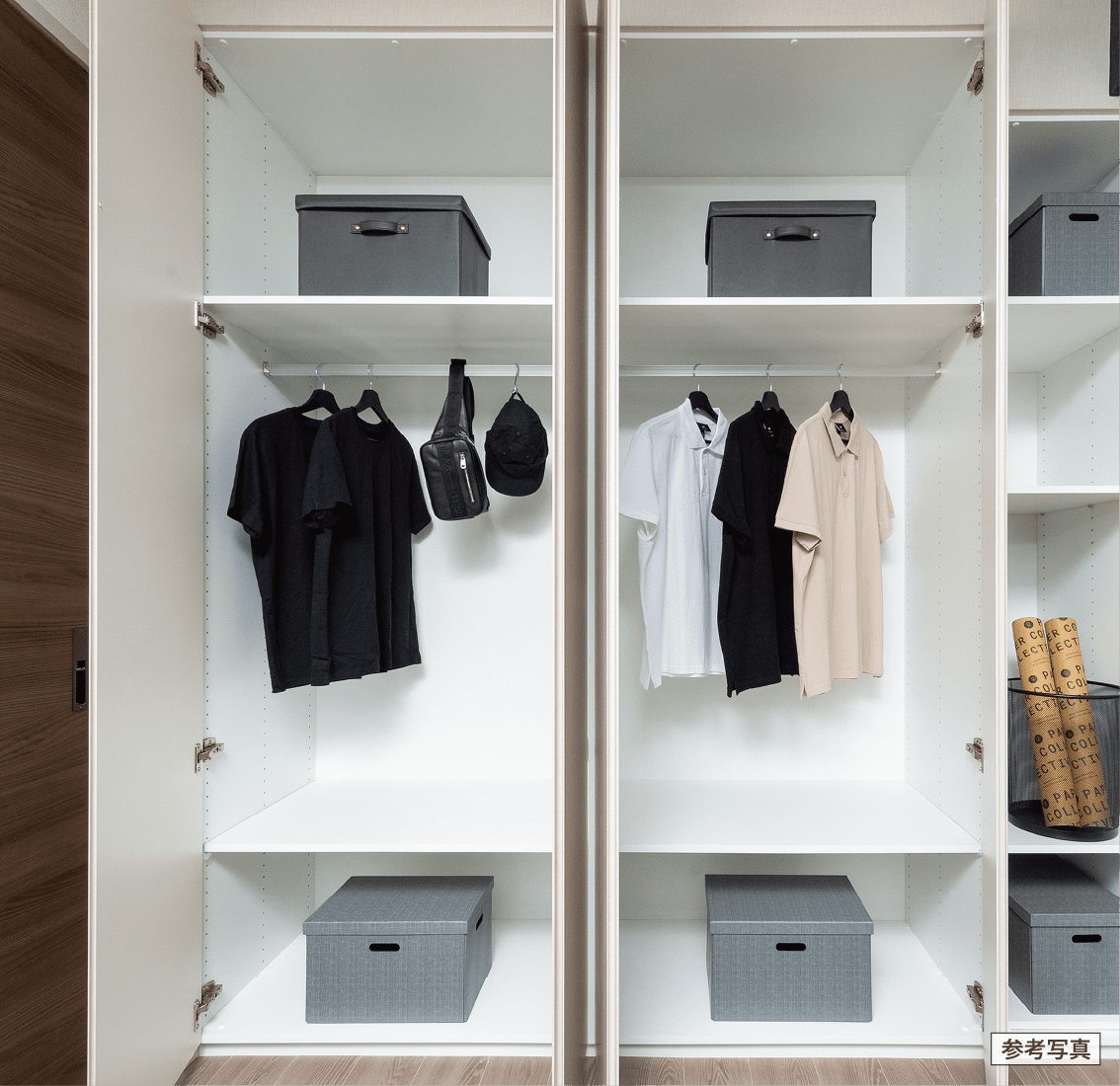 使い易さにこだわったクロゼットは、衣類はもちろん小物類も多く収納できるよう可動棚を設けて、整理しやすさに配慮しています。