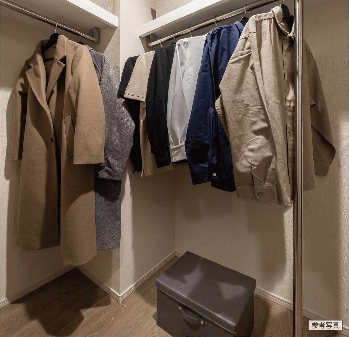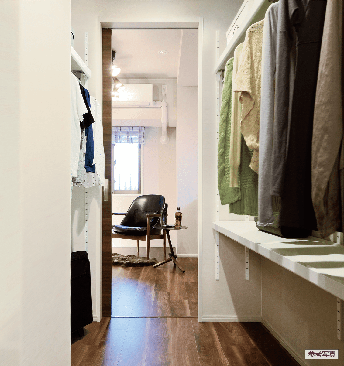 かさばるアイテムをたっぷり収納できるウォークスルークロゼット。洋室とリビング・ダイニングから出入りを可能とし、使い勝手を高めました。