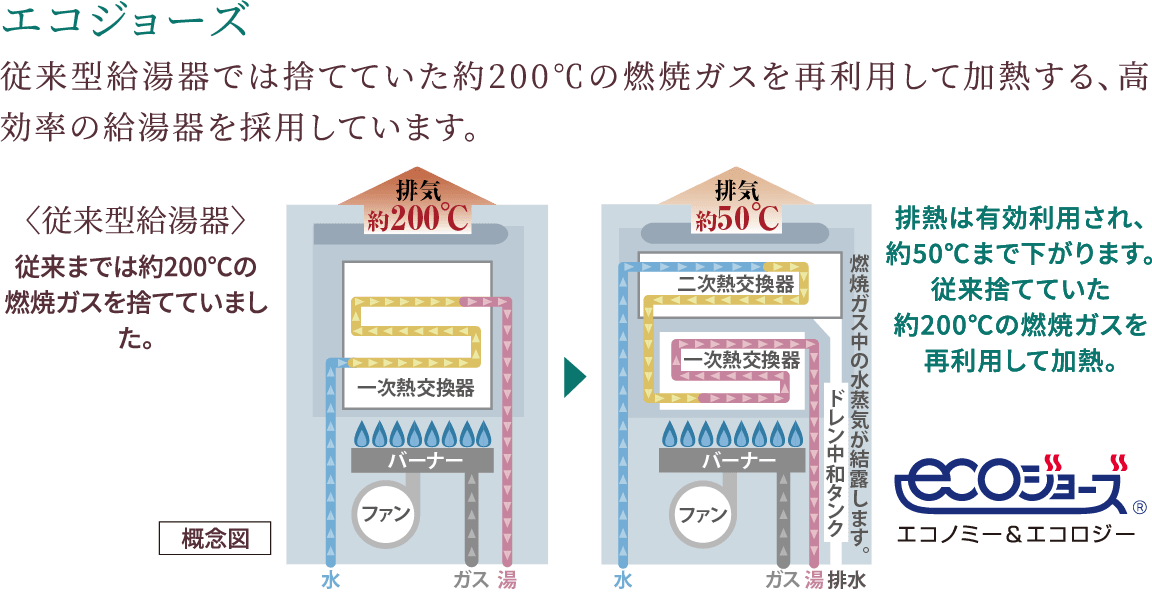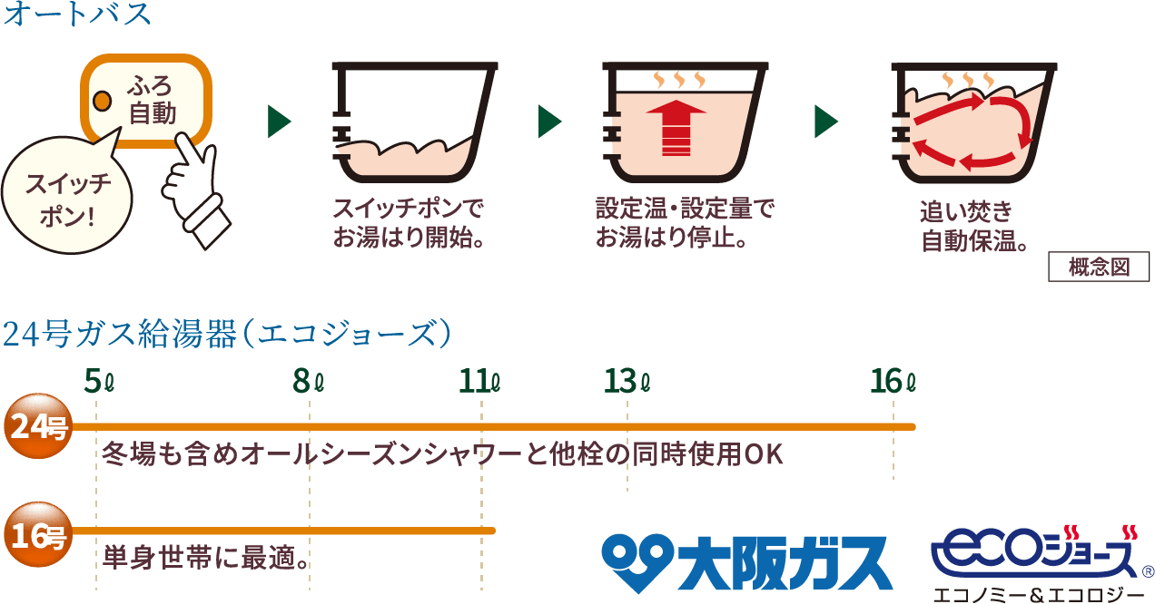 自動湯張り・保温機能付きのオートバスを採用。スイッチひとつでお湯張り完了です。操作はキッチンからワンタッチ。また、パワフルで湯量豊富な24号ガス給湯器(エコジョーズ)を採用。浴室、洗面室、キッチンの3カ所でたっぷりお湯が使えます。