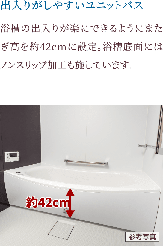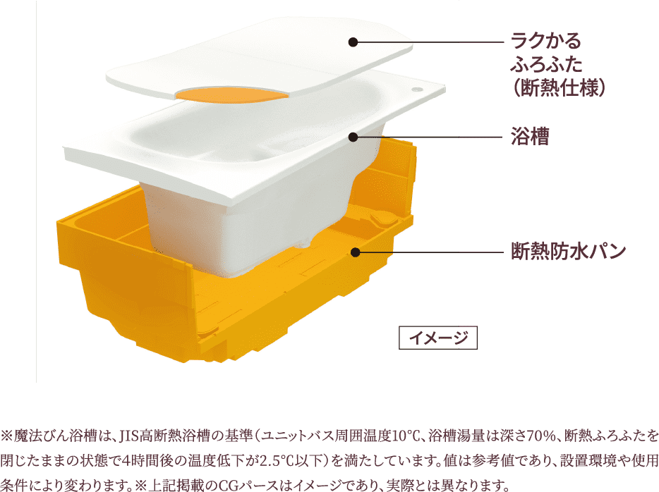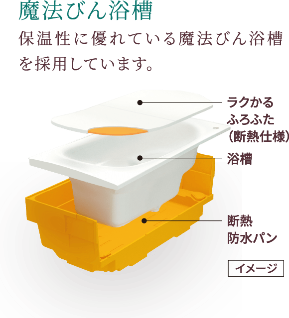 浴槽を断熱材で包み込み保温効果を高めた魔法びん浴槽(JIS高断熱浴槽準拠)を採用。4時間後の温度低下は約2.5℃。追い焚きも少なく経済的です。