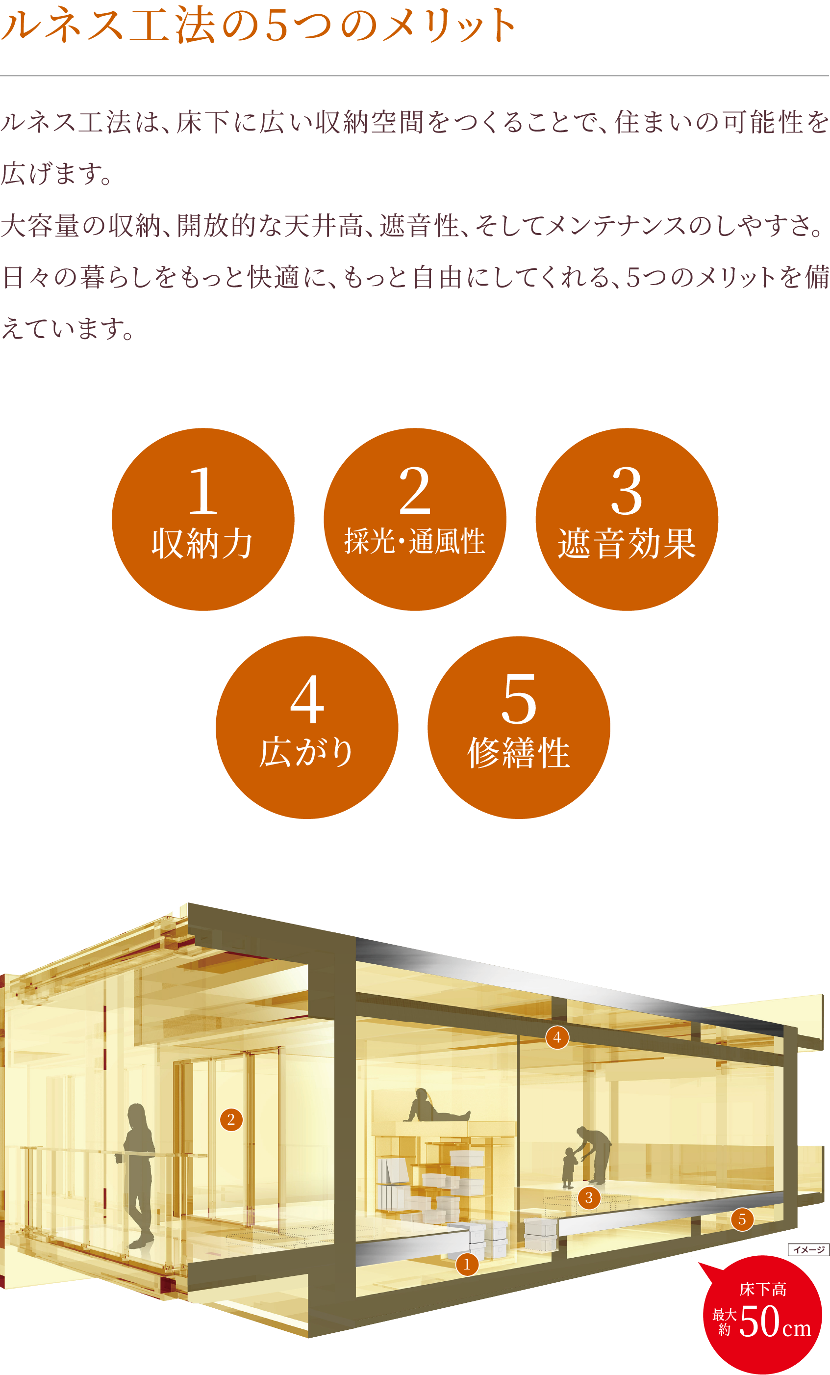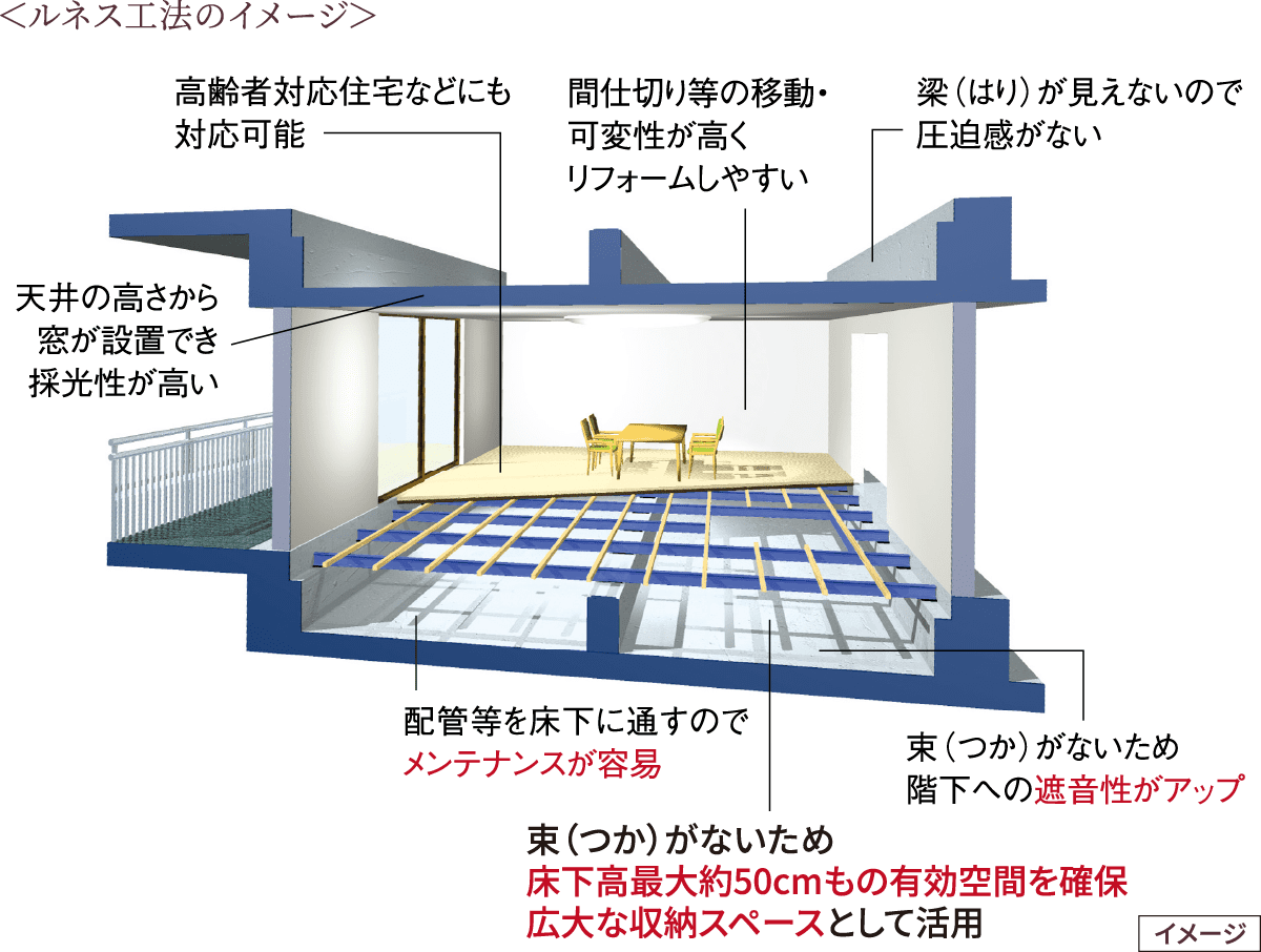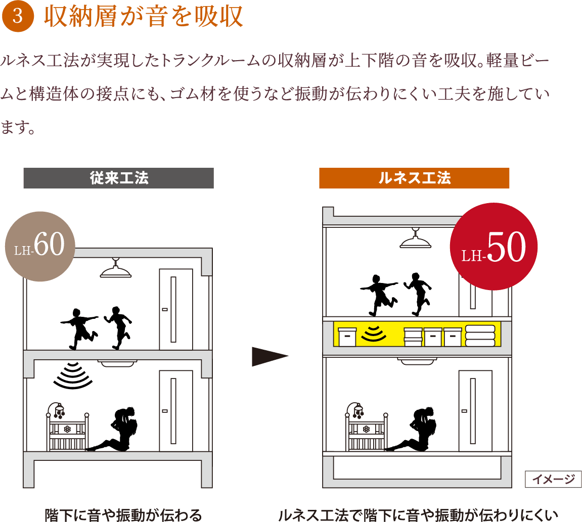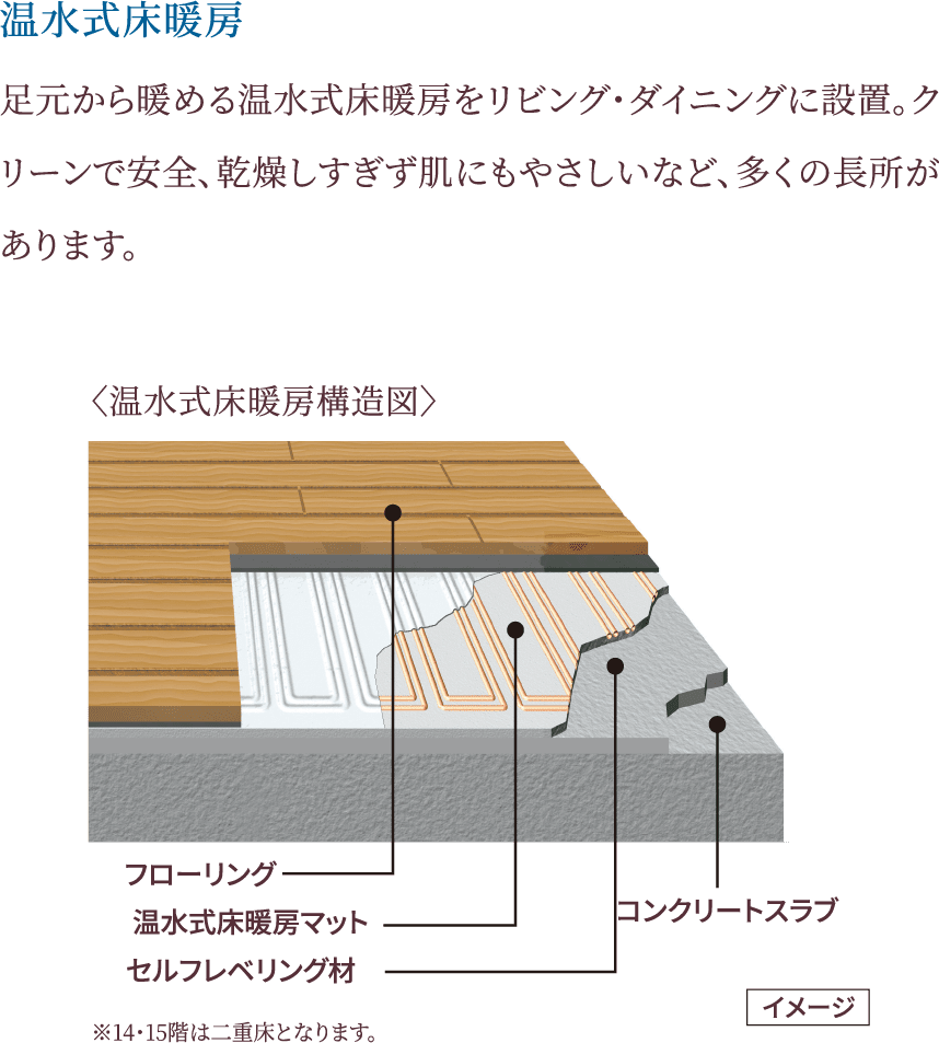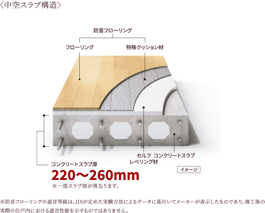 生活音の中で低音域の重い音(重量衝撃音)に対しては、220〜260mmの中空スラブ構造を(14・15階はルネス工法)、高音域の軽い音(軽量衝撃音)に対しては軽量床衝撃音低減性能がΔLL(Ⅰ)-4等級のフローリング材を採用し階下への音の伝わりを抑えています。