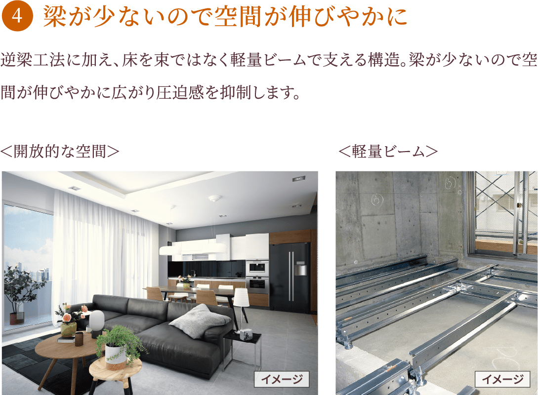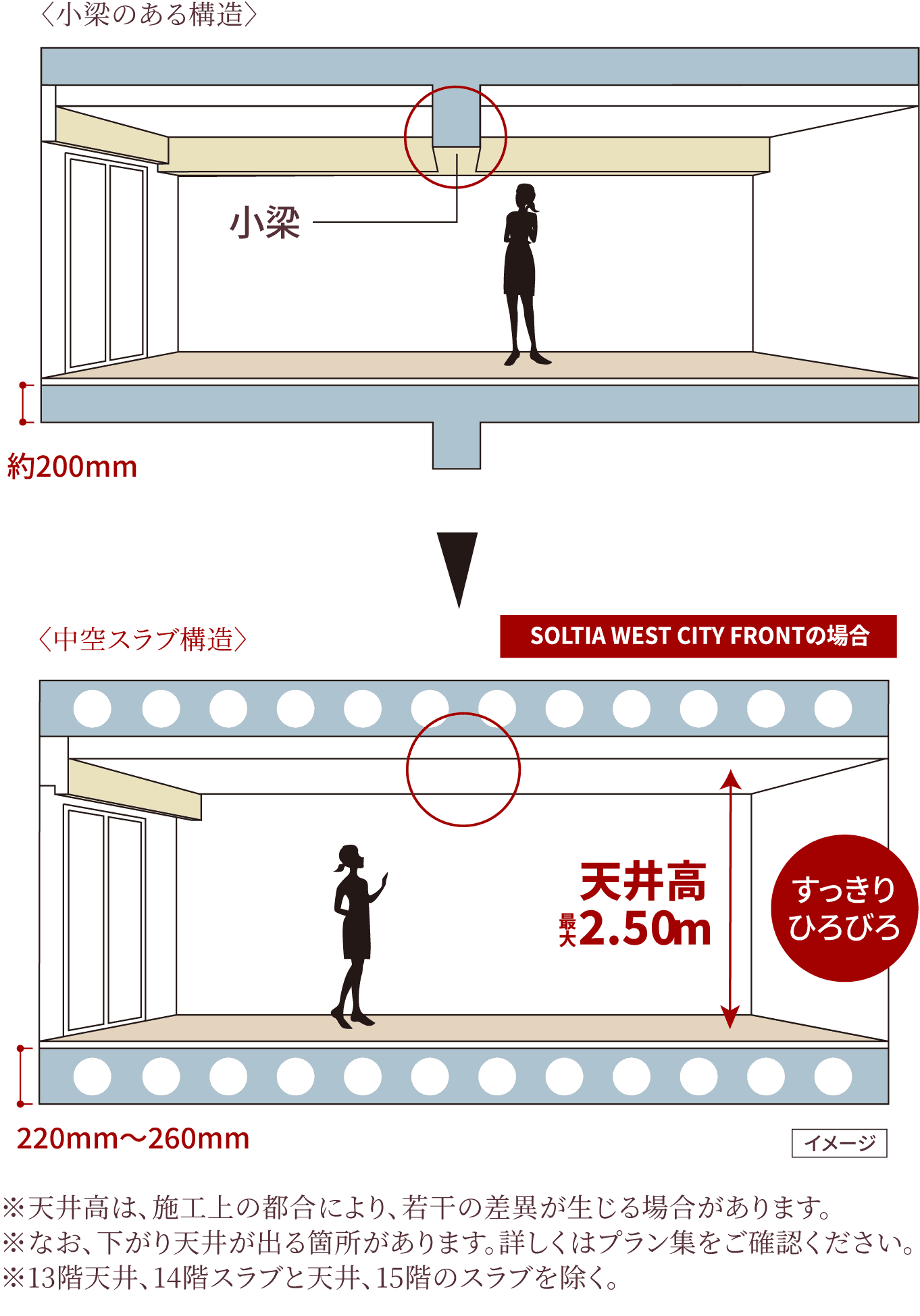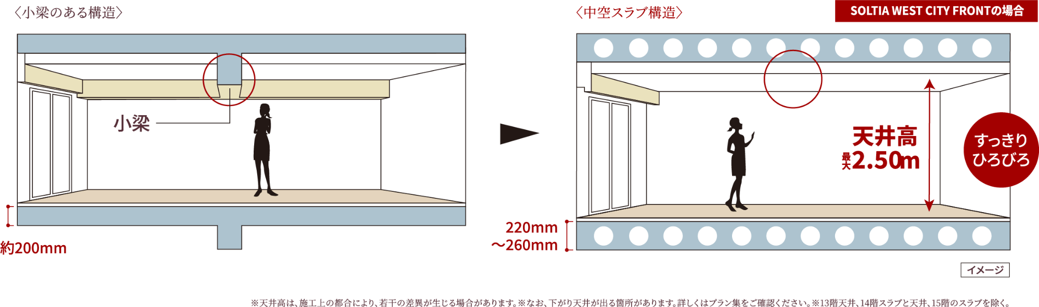 住戸内の開放感に大きな影響を与える天井高は、最大2.50mを確保。ゆとりある高さに加え、スラブ厚220〜260mmの中空スラブ構造を採用することにより、小梁の出ないすっきりとした室内空間を実現しています。