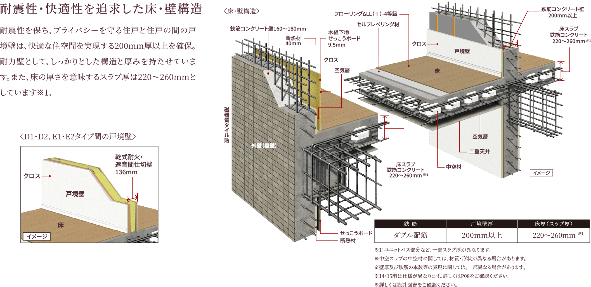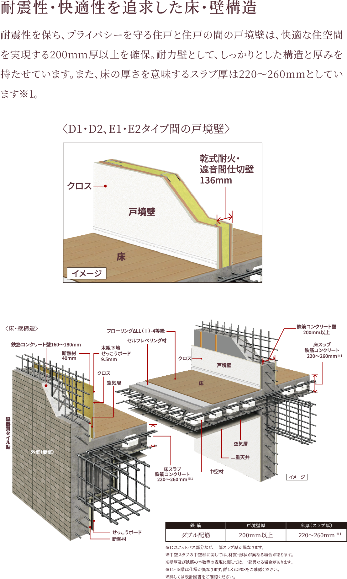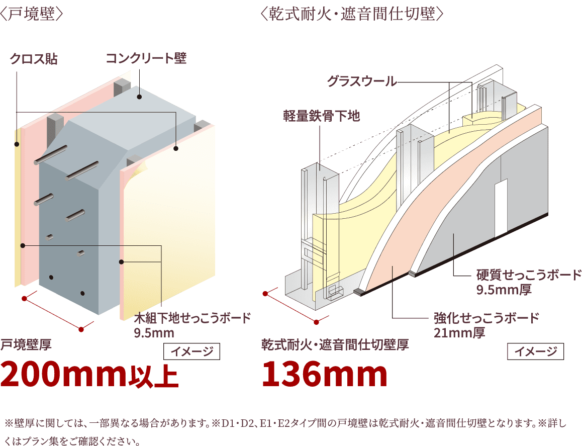 隣戸への音漏れに関係する戸境壁は、鉄筋コンクリート壁200mm厚以上または乾式耐火・遮音間仕切壁136mm厚として、日常生活に不便のない遮音性を実現しています。