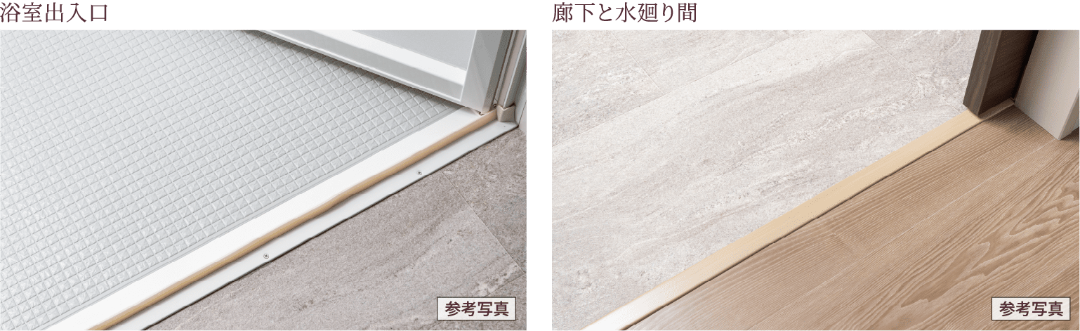 住戸内の浴室出入口や廊下と水廻り間など、段差を抑えた設計です。
