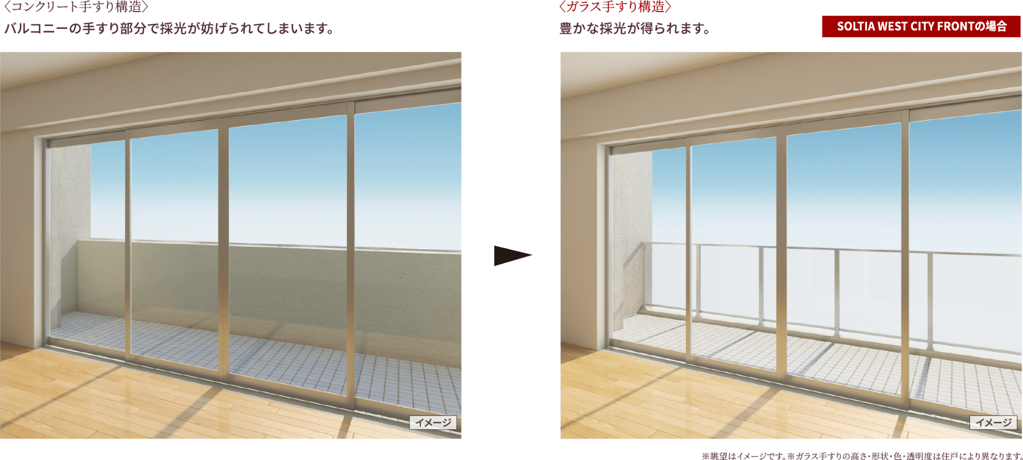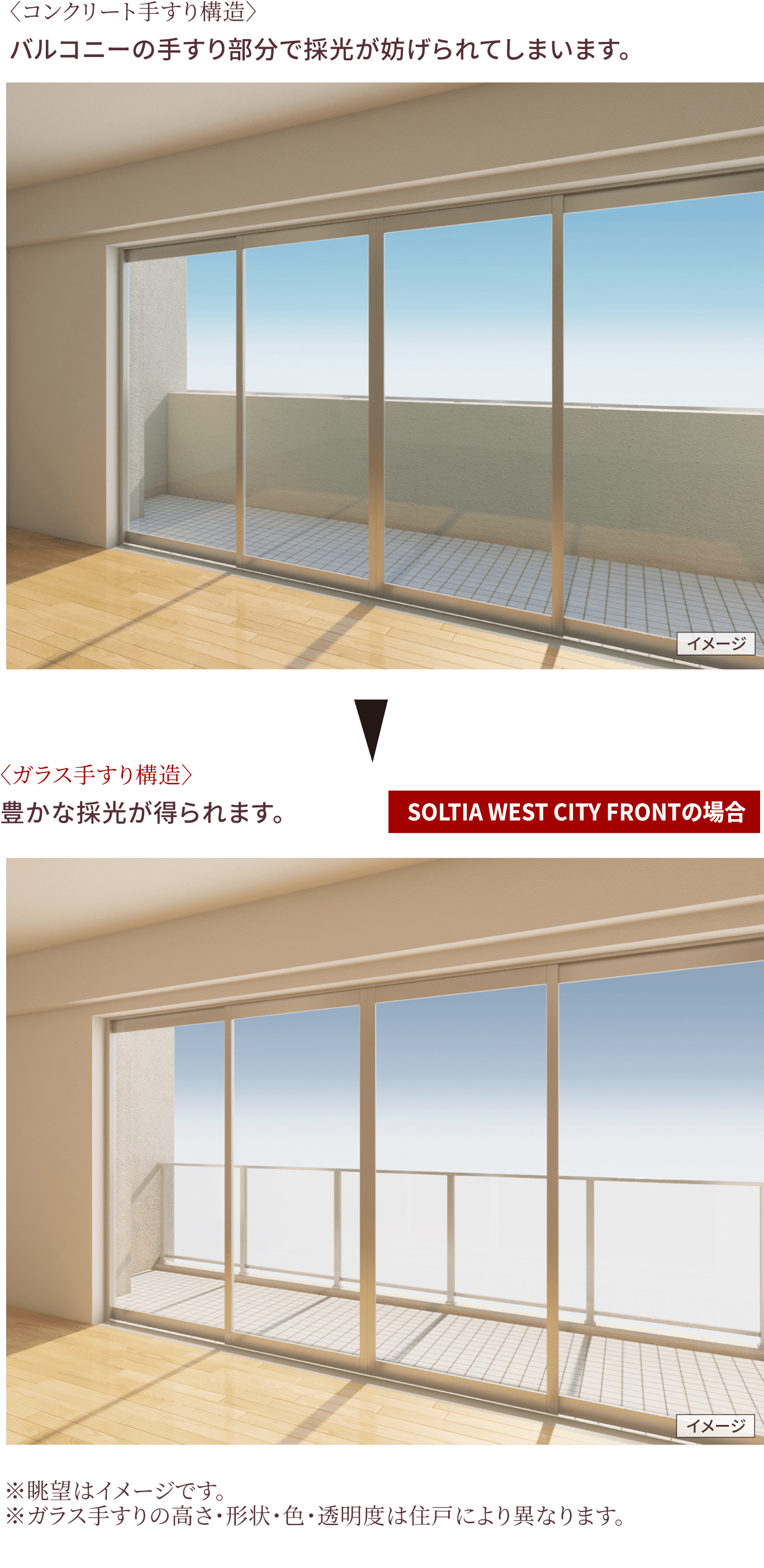 バルコニー手すりにガラス手すりと横ルーバー手すりを採用し※、外部からの視線をさえぎりながら充分な採光を確保。ガラス手すりには万一の破損でも飛散や脱落しにくい合わせガラスを使用しています。