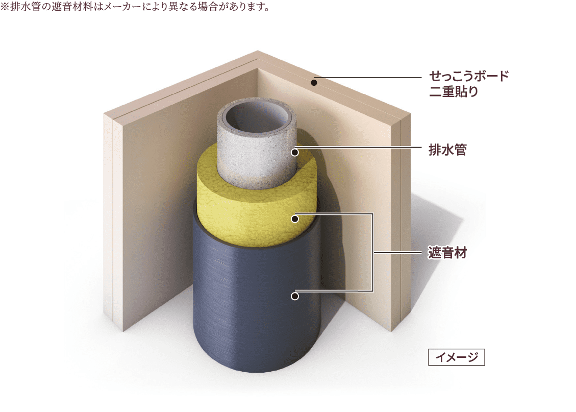 排水縦管からの流水音を軽減するため管を遮音材で巻き、二重貼りせっこうボード壁で包みました。