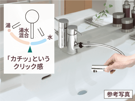 クリック感で水と湯を使い分け。吐水量も意識しやすいので、ガスのムダな消費を防ぎます。
